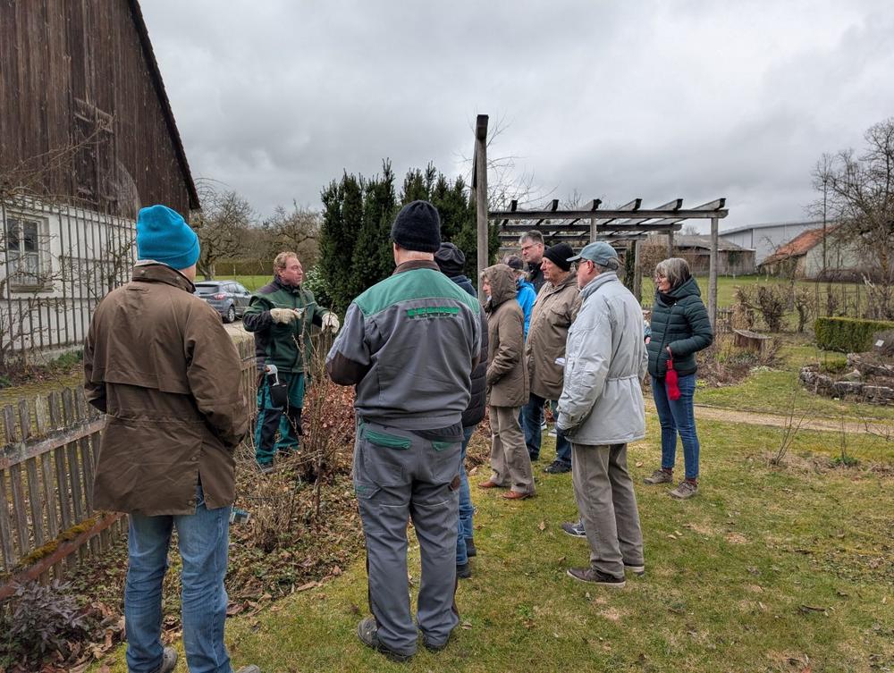 Trotz kaltem, etwas unbeständigem Wetter hörten die Teilnehmenden gespannt Charly Rembold zu, wie er einfach und praktisch den Rosenschnitt näher brachte. Dabei betonte er, dass niedrige Rosen jedes Jahr stark zurück geschnitten werden sollten. Aber auch Strauch- und Kletterrosen sollten jährlich verjüngt werden, indem ein bis zwei alte Triebe auf ca. 20 cm gekürzt werden.