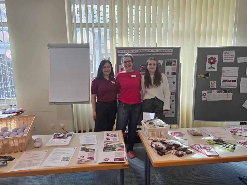 Unter dem Motto »Gesunde Pause – dein Rücken im Rampenlicht« fand am 11. März 2026 ein Gesundheitstag im Passauer Wolf Bad Gögging statt. Zwischen 10 und 15 Uhr konnten Mitarbeiter aller Abteilungen im Foyer des Passauer Wolf Reha-Zentrum Bad Gögging verschiedene Angebote besuchen. Im Mittelpunkt standen Ideen für eine gesunde Pause, praktische Tipps für einen rückenschonenden Alltag sowie der Austausch mit Kolleginnen und Kollegen und Fachkräften aus unterschiedlichen Bereichen. Vorgestellt wurden unter anderem Angebote des Betrieblichen Gesundheitsmanagements, darunter Betriebssport, Resilienz-Workshops, Augenyoga sowie digitale Unterstützungsangebote. Auch das Thema Ernährung spielte eine wichtige Rolle: Die Ernährungsberatung versorgte die Teilnehmer mit frisch zubereiteten Smoothies und gab Anregungen für gesunde Snacks und Mahlzeiten im Arbeitsalltag. Ergänzend luden Aktivitätsimpulse aus der Sporttherapie wie Faszien-Yoga oder Rückenzirkel dazu ein, Bewegung bewusst in die Pausen zu integrieren. Bei einem Stand der AOK konnten die Mitarbeiter beim sogenannten »Back-Check« ihre Muskelkraft testen und erfahren, ob Bauch und Rückenmuskulatur im richtigen Gleichgewicht stehen, mit anschließender Auswertung und Empfehlung. »Mit kleinen Veränderungen im Alltag lässt sich bereits viel für die Rückengesundheit erreichen. Unser Ziel war es, den Mitarbeitern unkomplizierte und alltagstaugliche Ideen mitzugeben«, erklärt Organisatorin Elke Scholz vom BGM-Team.