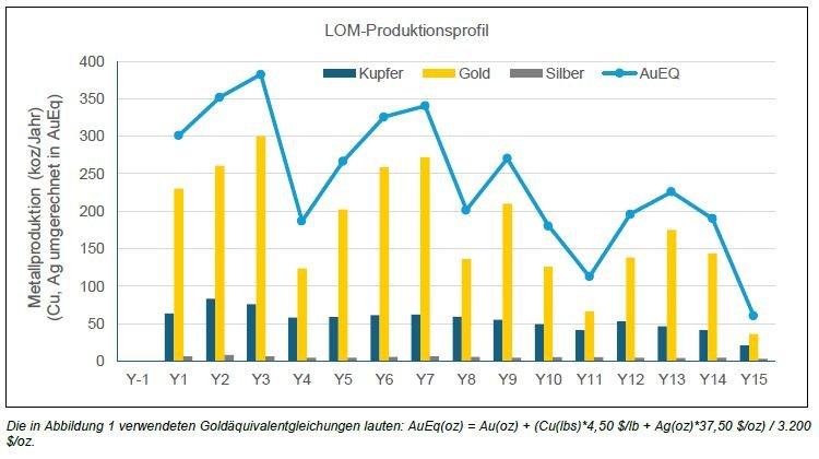 - Average annual production of 345,000oz gold equivalent (“AuEq”) per year estimated during the first three years of operations and total life of mine ("LOM") production of 3.6Moz AuEq, comprised of 2.6Moz gold, 6.9Moz silver, and 592Mlbs copper, over a 14.6 year mine life.