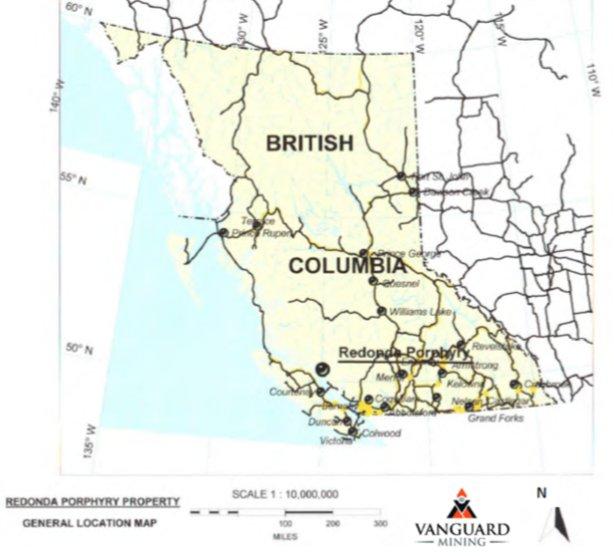 Das Projekt Redonda umfasst neun Mineralclaims mit einer Gesamtfläche von 2.746,46 Hektar auf West Redonda Island, etwa 40 km nordöstlich von Campbell River. Das Konzessionsgebiet ist ganzjährig per Lastkahn erreichbar und wird durch eine etablierte Holztransportinfrastruktur unterstützt.
