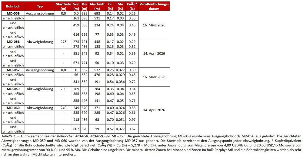 – Bohrloch MD-060 ergab 285 m mit 0,61 % CuÄq (0,47 % Cu und 0,026 % Mo), einschließlich 68 m mit 0,97 % CuÄq (0,70 % Cu und 0,051 % Mo), beginnend bei 249 m und endend in der Mineralisierung. Die letzten 19 m des Bohrlochs wiesen einen Gehalt von 0,67 % CuÄq* (0,52 % Cu und 0,027 % Mo) auf.
