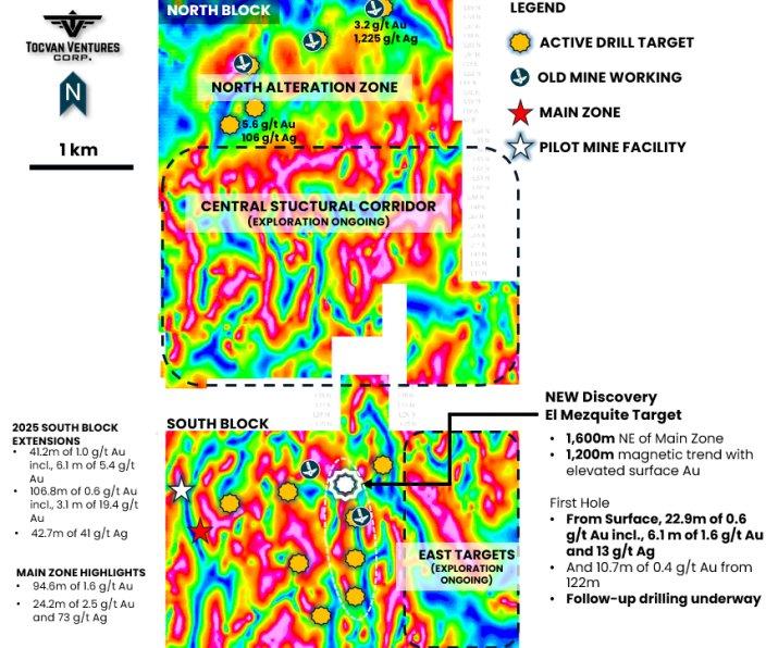 „Dies ist ein wirklich bedeutendes Ergebnis für Tocvan“, so CEO Brodie Sutherland. „Wir haben zum ersten Mal Bohrungen zur offensiven Erprobung eines Bereichs weit außerhalb der Main Zone im South Block absolviert und sind dabei unmittelbar an der Oberfläche auf eine Mineralisierung gestoßen. Der Standort innerhalb einer großen magnetischen Anomalie, die bereits die ausgeprägtesten geochemischen Goldwerte an der Oberfläche auf dem Projekt ergeben hat, unterstreicht das Größenpotenzial bei Gran Pilar. Nachdem wir bereits mehr als 2.400 Bohrmeter im Rahmen unseres vollständig finanzierten 20.000 Meter umfassenden Programms absolviert haben, sind wir gut aufgestellt, um diese neue Entdeckung zu erweitern und zusätzliche vorrangige Ziele zu prüfen. Aktuell wird 300 Meter östlich dieser Neuentdeckung gebohrt, um den derzeitigen östlichen Rand der bekannten Mineralisierung zu erproben. Unsere Programme für Bohrungen und den Pilotbetrieb der Mine sind vollständig finanziert. Mit einem klaren Weg zur kurzfristigen Pilotproduktion erhöhen diese frühen Ergebnisse aus dem South Block die Größe und das Potenzial von Gran Pilar in bedeutendem Maße.“