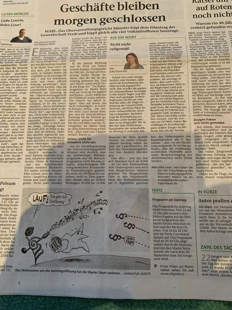 Beigefügt erhalten Sie die Pressemeldung, dass der von uns gewünschte verkaufsoffene Sonntag zum Ende einer dreiwöchigen von allen Marler Bürgern anerkannter kultureller in Klassik und moderner Musik ausgeprägter Marler Musiksommer […]