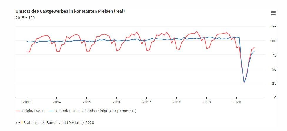 . +5,5 % real zum Vormonat (kalender- und saisonbereinigt) +5,4 % nominal zum Vormonat (kalender- und saisonbereinigt) -22,2 % real zum Vorjahresmonat -17,5 % nominal zum Vorjahresmonat Das Gastgewerbe in Deutschland hat sich im August 2020 […]